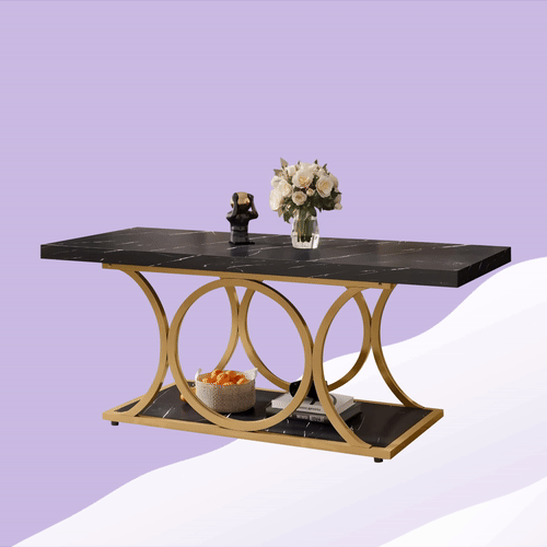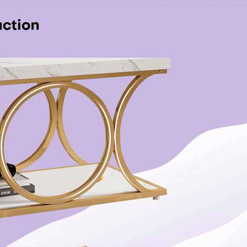 The table’s top tier features a luxurious faux marble finish, not only adding an element of sophistication but also boasting waterproof, scratch-resistant qualities for ease of maintenance. The stylish metal base, with its intricate circular and arc design, transforms what could be just a simple table into a remarkable piece of art. This coffee table doesn’t just stand—it captivates.